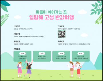 경남고성군(군수 이상근)은 관광객 유치증대 및 체류형 관광 활성화로 지역경제에 활력을 불어넣기 위해 2026년 신규사업으로 ‘마음이 쉬어가는 곳, 힐링해 고성 반값여행’을 시행한다고 밝혔다.