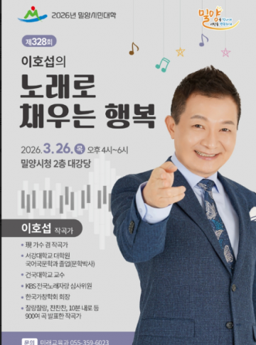 경남 밀양시는 오는 3월 26일 오후 4시 시청 대강당에서 제328회 밀양시민대학 강연을 개최한다. 이번 강연은 대한민국 대표 작곡가이자 방송인인 이호섭 씨를 초청해 ‘노래로 채우는 행복’이라는 주제로 진행된다.