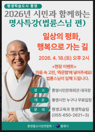 통영시(시장 천영기)는 오는 4월 18일(토) 오후 2시, 통영시민문화회관 대극장에서 「평생학습도시 통영, 2026년 시민과 함께하는 명사초청 강연」의 두 번째 순서로 법륜스님을 초청해 명사 특강을 개최한다.
