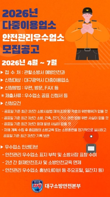 대구소방안전본부는 시민들이 안심하고 이용할 수 있는 환경을 조성하고, 영업주의 자율적인 안전관리 의식을 높이기 위해 ‘2026년 다중이용업소 안전관리 우수업소’ 신청을 접수한다.