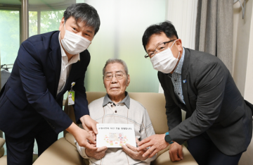 김현수 수원시 제1부시장이 19일 보훈원을 방문해 오성규 애국지사(100)에게 수원시 주민등록증을 전달했다.