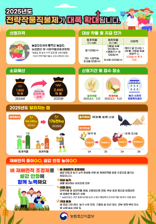 한편, 올해부터 하계작물로 깨(참깨, 들깨)가 추가됐으며, 밀(동계)의 직불금 ha당 단가는 지난해 50만 원에서 100만 원으로, 조사료(하계)는 430만 원에서 500만 원으로 각각 상향됐다.