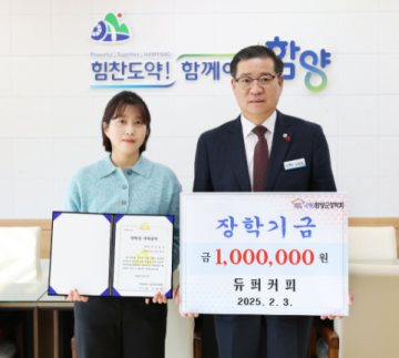 함양군 장학회는 2월 3일 듀퍼커피와 현대광고기획에서 각각 100만 원의 장학금을 전달했다고 밝혔다.