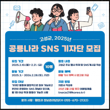 경남고성군(군수 이상근)은 지역의 다양한 소식을 생생하게 전달할 2025년도 공룡나라 SNS 기자단을 모집한다. SNS 기자단은 고성군의 주요 시책, 관광지, 문화·축제·행사, 생활정보를 직접 취재하고 블로그와 인스타그램을 통해 널리 알리는 역할을 맡게 된다.