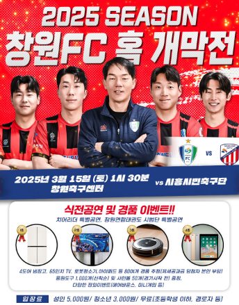 또, 하프타임과 경기 종료 후 추첨 이벤트를 통해 4도어 냉장고, 65인치(QLED) TV, 로봇청소기, 아이패드 등 경품(제세공과금 본인부담) 80여 개가 제공된다. 또, 이날 창원축구센터 장외에서는 ‘에어바운스 축구’와 ‘미니게임’ 등 다양한 체험 이벤트로 경기장을 찾은 시민들에게 즐거움을 선사할 예정이다.