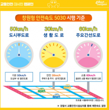 창원특례시는 ‘창원형 안전속도 5030’ 정책을 알리고 시민의 실질적인 참여를 유도하기 위해 대시민 캠페인을 전개한다고 20일 밝혔다. 캠페인은 도심 중심지와 주거지역에서의 교통사고를 줄이기 위한 대책의 일환이다.