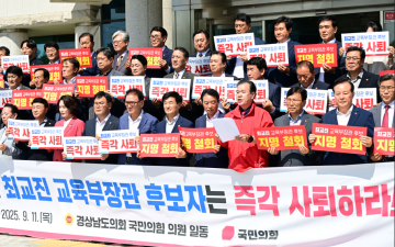 경상남도의회 국민의힘 의원 일동은 11일 최교진 교육부 장관 후보자의 지명 철회와 자진 사퇴를 촉구했다. “교육 수장은 도덕성·공정성·정치적 중립성에서 국민의 신뢰를 받아야 한다”며, “인사청문회에서 제기된 여러 논란을 감안할 때 기준에 현저히 미달한다”고 밝혔다.
