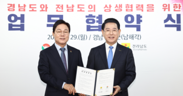 경상남도(도지사 박완수)와 전라남도(도지사 김영록)는 29일 남해군 남해각에서 ‘경남·전남 상생협력 업무협약’을 체결하고, 양 도 간 실질적인 공동 발전을 추진하기로 했다.