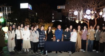 1일 울산시청 마당 실개천에서 ‘울산시청 마당 경관조명 점등식’이 열린 가운데 김두겸 울산시장이 직원들과 점등 버튼터치 후 조명 장식을 배경으로 기념촬영을 하고 있다.