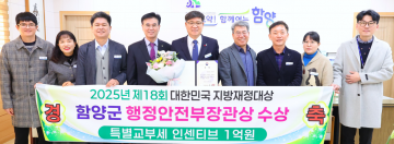 함양군이 행정안전부가 주관하는 ‘2025년 제18회 대한민국 지방재정대상’에서 우수사례로 선정돼 행정안전부 장관상을 받으며, 특별교부세 1억 원을 확보했다.