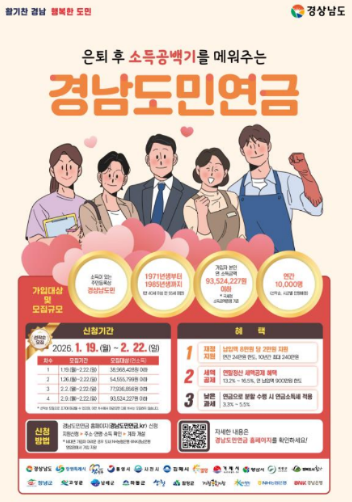 경상남도(도지사 박완수)는 도민의 소득 공백기 해소와 안정적인 노후 준비를 지원하기 위한 ‘경남도민연금’ 가입자 모집을 1월 19일부터 본격적으로 시작한다.
