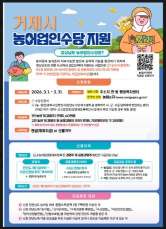 거제시는 농어업·농어촌의 공익적 기능을 유지·증진하고 농어업인의 소득 안정을 지원하기 위해 ‘2026년 농어업인수당’ 신청을 3월 1일부터 3월 31일까지 접수하고 있다.