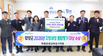 함양군이 경상남도가 주관한 ‘2026(2025년 실적) 지방세정 종합평가’에서 최고 등급인 대상을 받아 상사업비 5억 원과 도지사 기관 표창을 받는 쾌거를 이뤘다.