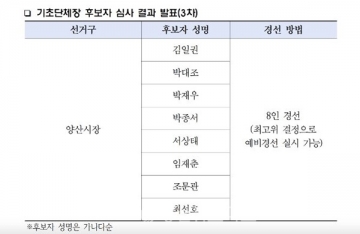 또 광역의원(경남도의원)은 양산 제1선거구 이상열, 제4선거구 표병호, 제5선거구 성낙평, 제6선거구 성동은 출마자들이 모두 단수공천으로 확정됐다.