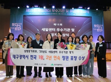 대구광역시는 성평등가족부가 주관한 ‘2025년 여성경제활동촉진 지원사업 평가’에서 전국 우수 지자체로 선정되는 쾌거를 이뤘다. 시는 지난 3월 27일(금) 서울 마포중앙도서관에서 열린 ‘2026년 새일센터 우수기관 및 유공자 포상식’에 참석해 우수기관 표창을 수상했다.